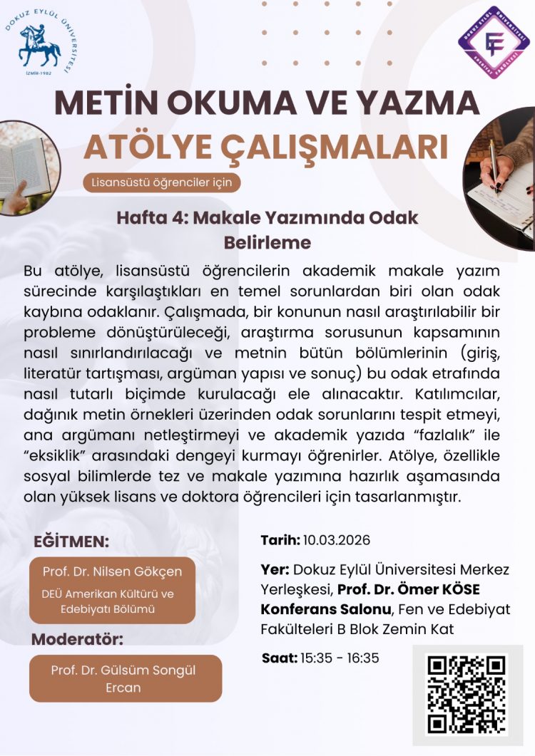 DEÜ Edebiyat Fakültesi Atölye Calışmaları Serisi: Hafta 4 Yayınlanma Tarihi ve Saati: 07/03/2026 - 12:54 - Görüntülenme: 14