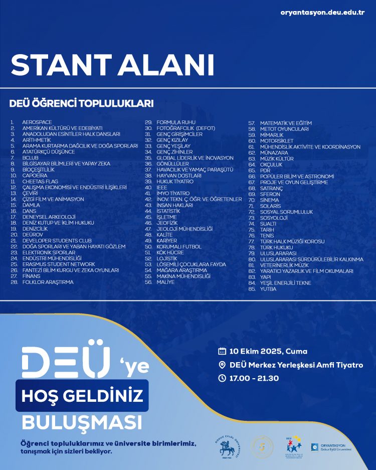 DEÜ’ye Hoş Geldiniz Buluşması (TARİH DEĞİŞİKLİĞİ OLMUŞTUR!!) Yayınlanma Tarihi ve Saati: 08/10/2025 - 10:26 - Görüntülenme: 207